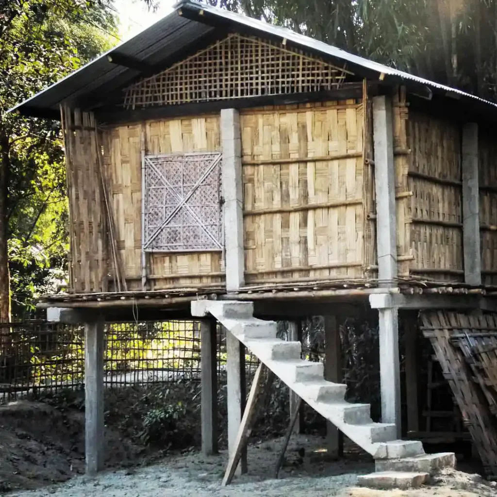 Additionally, this design improves air circulation, which helps to keep the living area cooler during the scorching summer months in Assam. The buildings are robust to earthquakes and floods because they are constructed with lightweight materials on stilts.